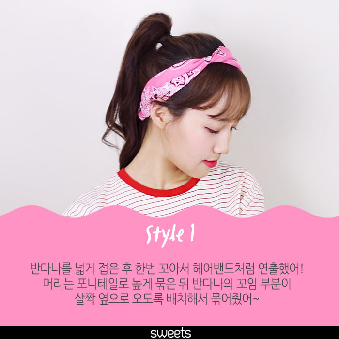 シンプルなポニーテールも、バンダナで元気なイメージになります。